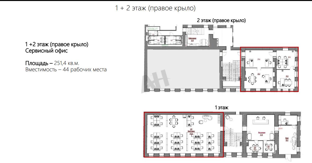 Лот №1010491 Сдается в аренду сервисный офис, смешанная планировка. 1 +2 этаж (правое крыло на планировке) Площадь – 251,4 кв.м. Вместимость – 44 рабочих места - рабочая мебель - клининг и расходные материалы - принтер и печать документов - оборудованный кофепоинт - администратор и управляющая компания - эксплуатационные расходы и коммунальные платежи - интернет - переговорная комната (бесплатно – 2 часа в день) - мелкий ремонт. Качественная отделка, центральная система кондиционирования и приточно-вытяжная система вентиляции, городская парковка. Круглосуточная охрана. Пешая доступность метро. Зонирование помещение возможно по договоренности, легковозводимыми перегородками. Расположение: 10 минут пешком от станции «Парк культуры» В здании: - СКУД и видеонаблюдение - Круглосуточная охрана - Управляющая компания от собственника Парковка: городская 2 м/м на внутренней территории стоимость 30 500 руб /мес за 1 м/м Стоимость аренды: 91 500 руб/м2/год (1 916 925 руб. в месяц). В цену включено: затраты на электричество, коммунальные расходы, уборка, эксплуатационные расходы.