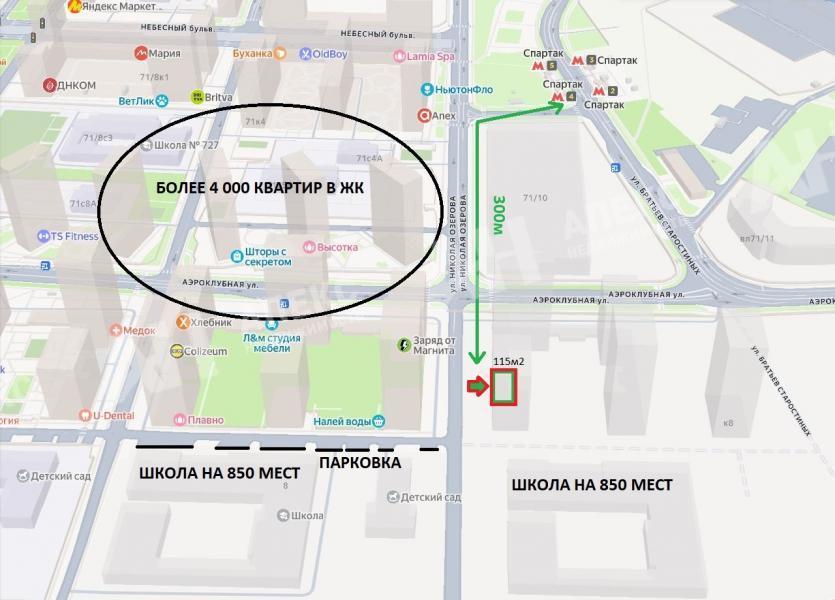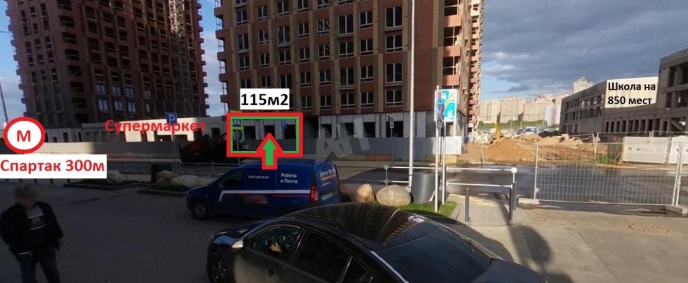 Лот №1058533 Сдаётся в аренду помещение свободного назначения площадью 115 м2 всего в 3 мин. пешком от станции метро "Спартак" (300м) в Новом ЖК "Holland park" комфорт-класса серия + с отделкой (быстрое заселение) на 4 245 квартир (более 12 000 жителей). Помещение выгодно расположено на первой линии по пути от метро к самым крупным школам и садам в ЖК на 850 мест каждая. Дом сдан и активно заселяется, ключи в мае 2026г. Помещение окружено якорями трафика - соседняя дверь с супермаркет, через дорогу супермаркет, соседний угол ПВЗ WildBerries. Открытая планировка, витринные окна, высокие потолки 4.5м, мощность 20кВт, отдельный вход с улицы, на против помещения пешеходный переход и большая наземная парковка. Стоимость аренды: 46 800 руб/м2/год (448 500 руб. в месяц). В цену не включено: эксплуатационные расходы.