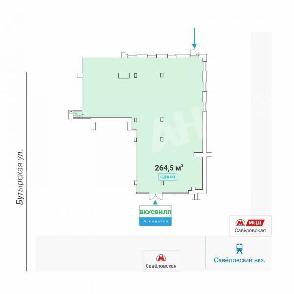Лот №957741 Продаётся готовый арендный бизнес, торговое помещение площадью 264.5 м2 всего в 2 мин. пешком от станции метро "Савёловская" и Савёловского вокзала. Арендатор - сетевой продуктовый магазин "ВкусВилл", МАП - 1 050 000 руб., ДДА на 5 лет. Первая линия, сверхинтенсивный пешеходный трафик, сложившееся торговое окружение. В помещении открытая планировка, новые большие витрины, отдельный вход с фасада и второй вход под разгрузку со двора, место под вывеску, вытяжной воздуховод до уровня кровли, потолки 4.7 м.