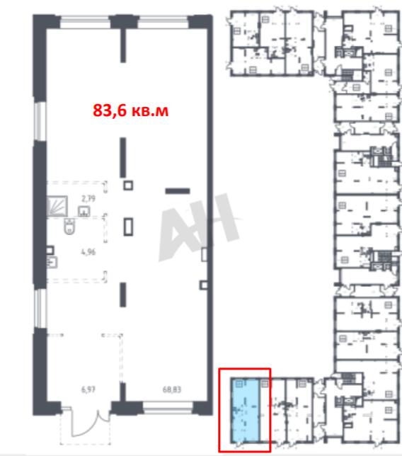 Лот №988956 Коммерческое помещение 83,6 м². ЖК «Алхимово» О помещении: Площадь — 83,6 м². Формат — стрит-ритейл на первом этаже. Отдельный вход с улицы, витринное остекление. Высота потолков — 4 м. Электрическая мощность — 15 кВт. Центральные коммуникации, предусмотрена техническая вытяжка. Помещение имеет правильную прямоугольную планировку, что повышает ликвидность и подходит под любые форматы торговли и услуг. Корпус сдан, ключи получены. Локация: Помещение расположено в угловой части фасада — на первой линии комплекса. Рядом детский сад, игровые и спортивные площадки В шаговой доступности — остановка общественного транспорта Главный бульвар ЖК формирует стабильный пешеходный поток. В перспективе планируется станция метро в пределах жилого района. Преимущества: Высокая видимость и угловая локация. Правильная геометрия помещения, востребованная у арендаторов. Развитый жилой массив с устойчивым трафиком. Готовность к эксплуатации — ключи на руках. Показ возможен по договорённости.