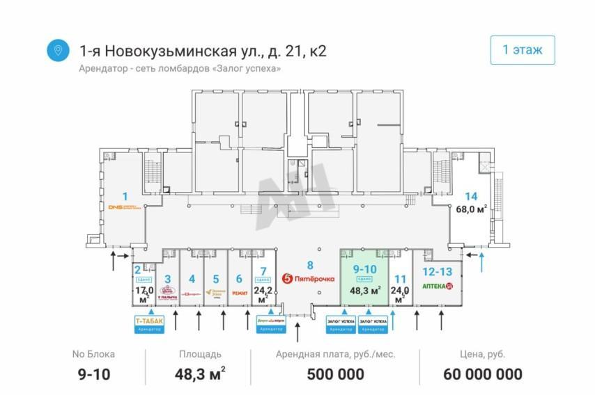 Лот №997269 Продается помещение свободного назначения формата Street Retail в ЮВАО Москвы, общей площадью 48.3 кв.м. Объект расположен в пяти минутах пешком от станции метро «Рязанский проспект» на первой линии домов с активным пешеходным трафиком. Локация характеризуется плотным жилым массивом и сложившимся торговым окружением. В качестве ориентира успешного использования можно рассматривать действующего арендатора — комиссионный магазин, демонстрирующий устойчивый спрос. Рядом со зданием предусмотрена бесплатная парковка. Месячный арендный платеж составляет 500 000 рублей.